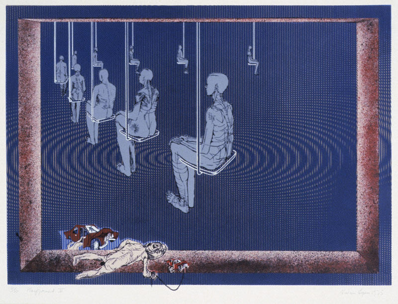 The title of the Playground series immediately evokes associations of childhood fun. However, in Lynn’s images the word takes on much darker connotations. The bodies populating this nightmarish playground are adults. Naked and genderless, they work the swings and see-saws with mute, exhausted determination. The structures of the playground become the machines of an incarcerating system which simultaneously governs and produces human beings. In Playground IV, the figures on the swings hang in a non-space, diligently swinging as if by their action they are powering some unseen giant machine. Playground VI, which shows human forms subsumed into a ceaselessly rotating system of cogs and wheels, is a direct, passionate statement about human imprisonment in confining social structures.