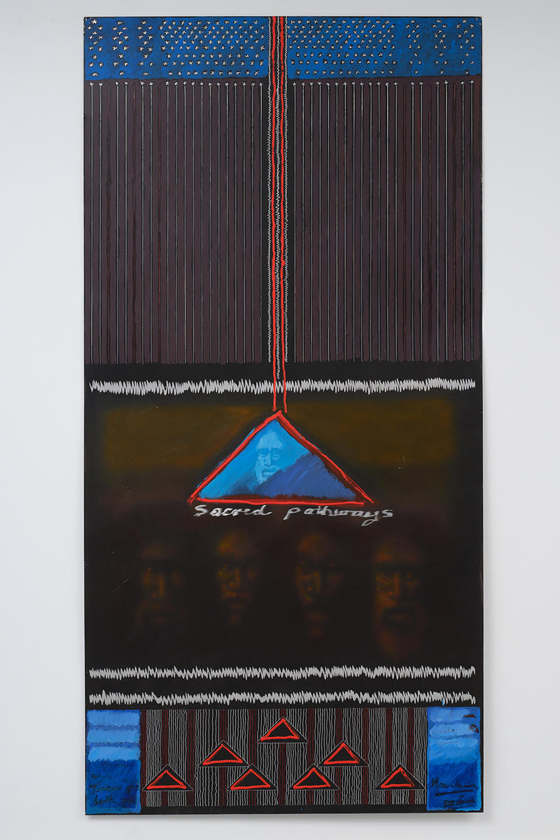 This painting is from a series based on the migrations of peoples throughout Te Moana-nui-a-Kiwa with the aid of tohu (signs) such as stars, seasonal winds, bird flight and ocean currents. Embedded in these paintings are the origin narratives of the Te Kāhui maunga people of Taranaki. A people who preceded the arrival of the seven waka Aotea, Kurahaupō, Tokomaru, Tainui, Te Arawa, Mataatua and Tākitimu—represented here as seven maunga or niho—who carried the ancestors of Māori to these shores.