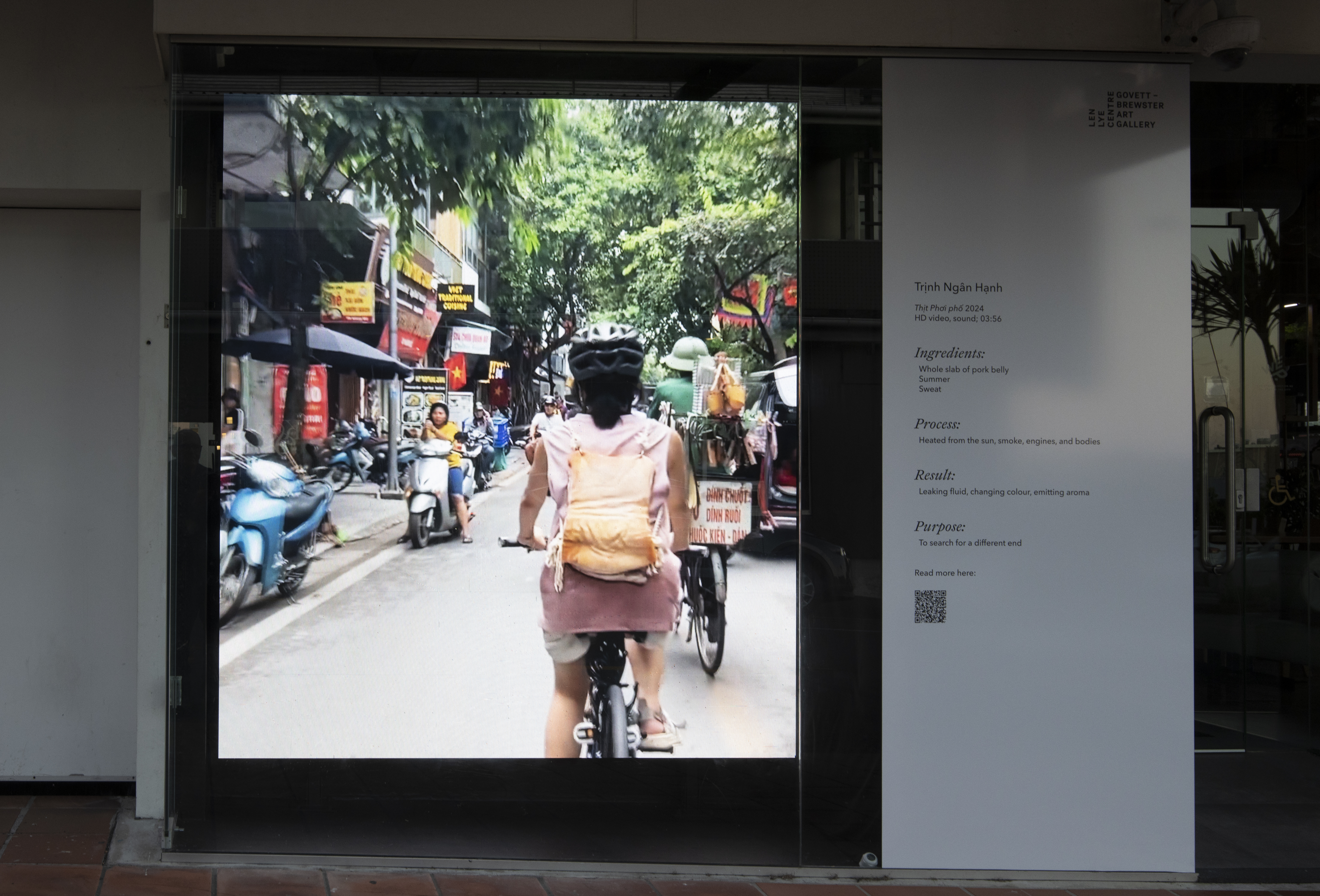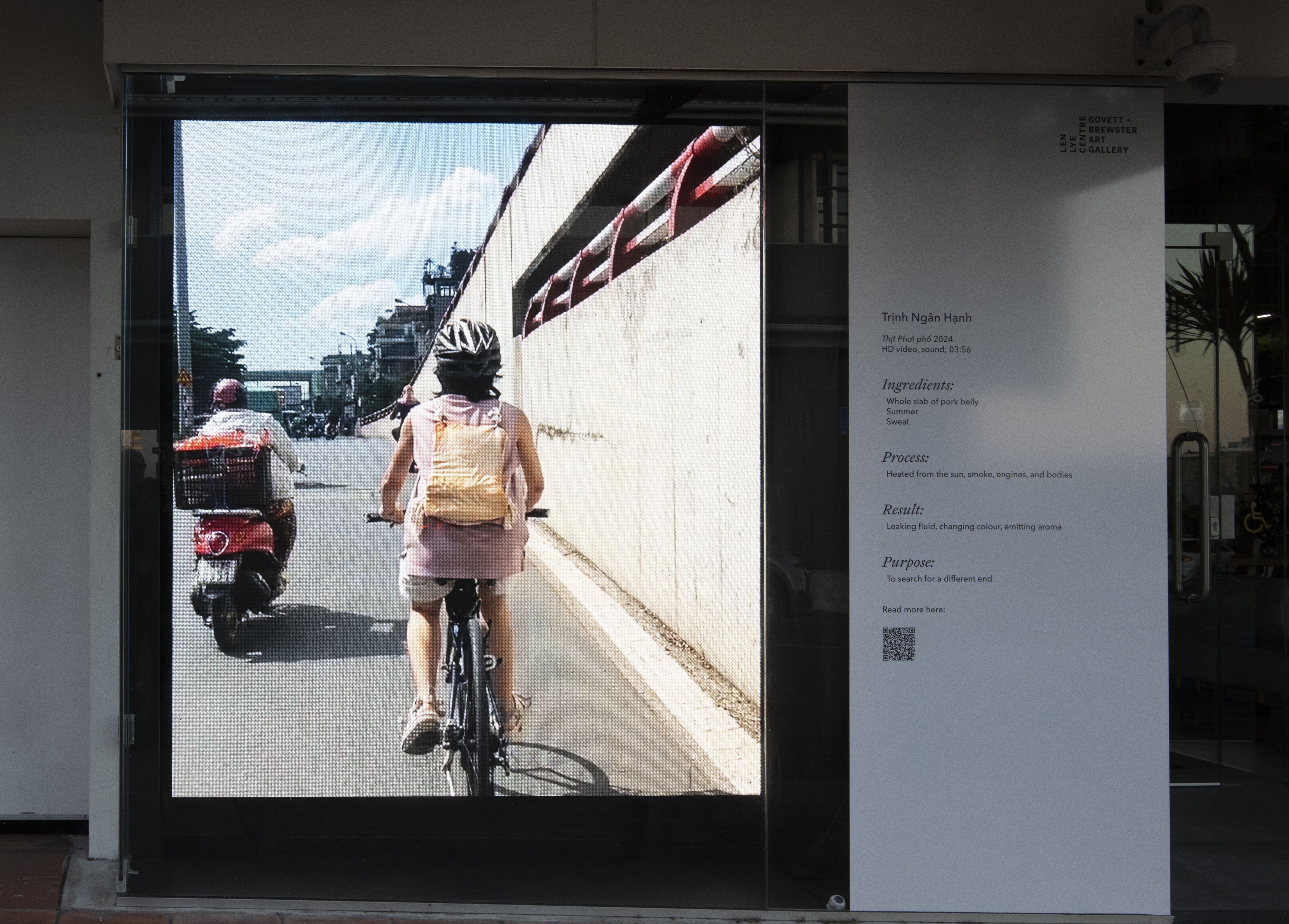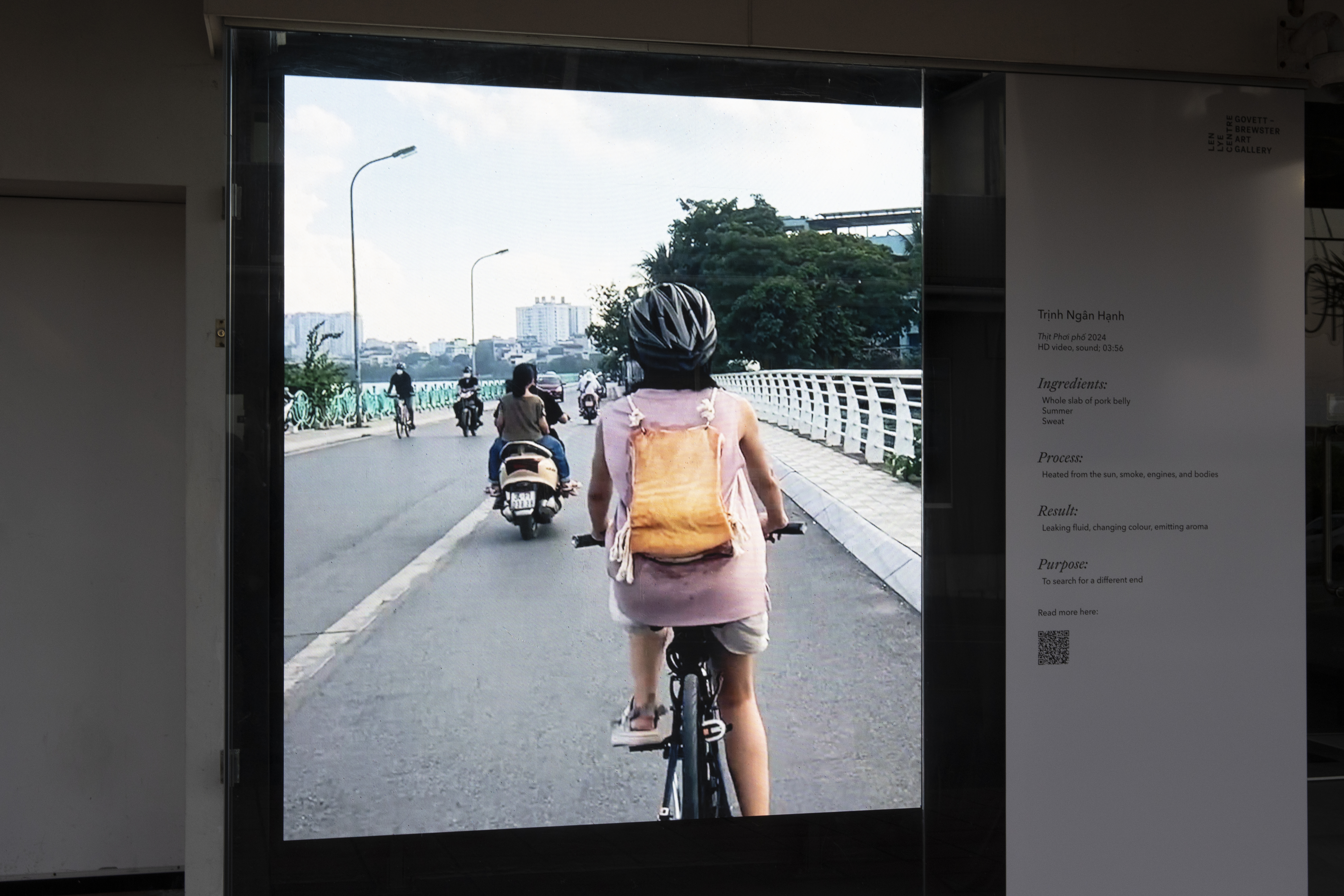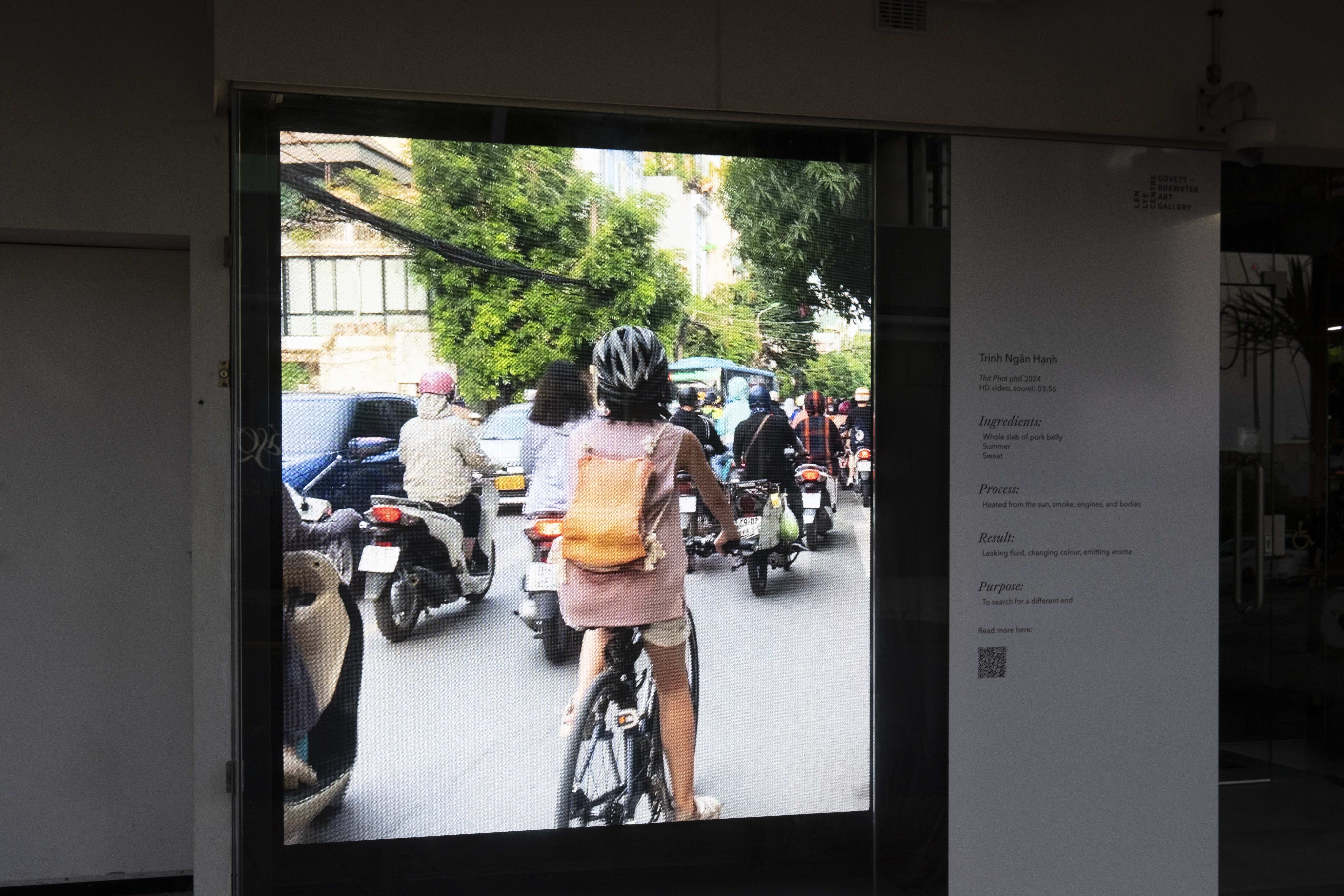 As a gesture, Trịnh Ngân Hạnh’s work interrogates the role and place of the animal within urban environments. Most often found caged, or stray, or served on a plate, animals tend to be treated as aberrations in a setting built with human development and the flow of goods and capital in mind. The artist’s playful act of displacing fleshy matter might evoke disgust—as the meat transforms from pink to dull brown over the course of the video—or it might invite a comparison between the hoards of human travellers stuck at a crawling pace in traffic, and animals funnelled through the industrial farming system from pasture to processing plant to dinner table. In its play with the proximity and distance between people, creatures and the environment in which they are situated, the work, as the artist suggests, proposes “a softening of the boundary between human and meat.”