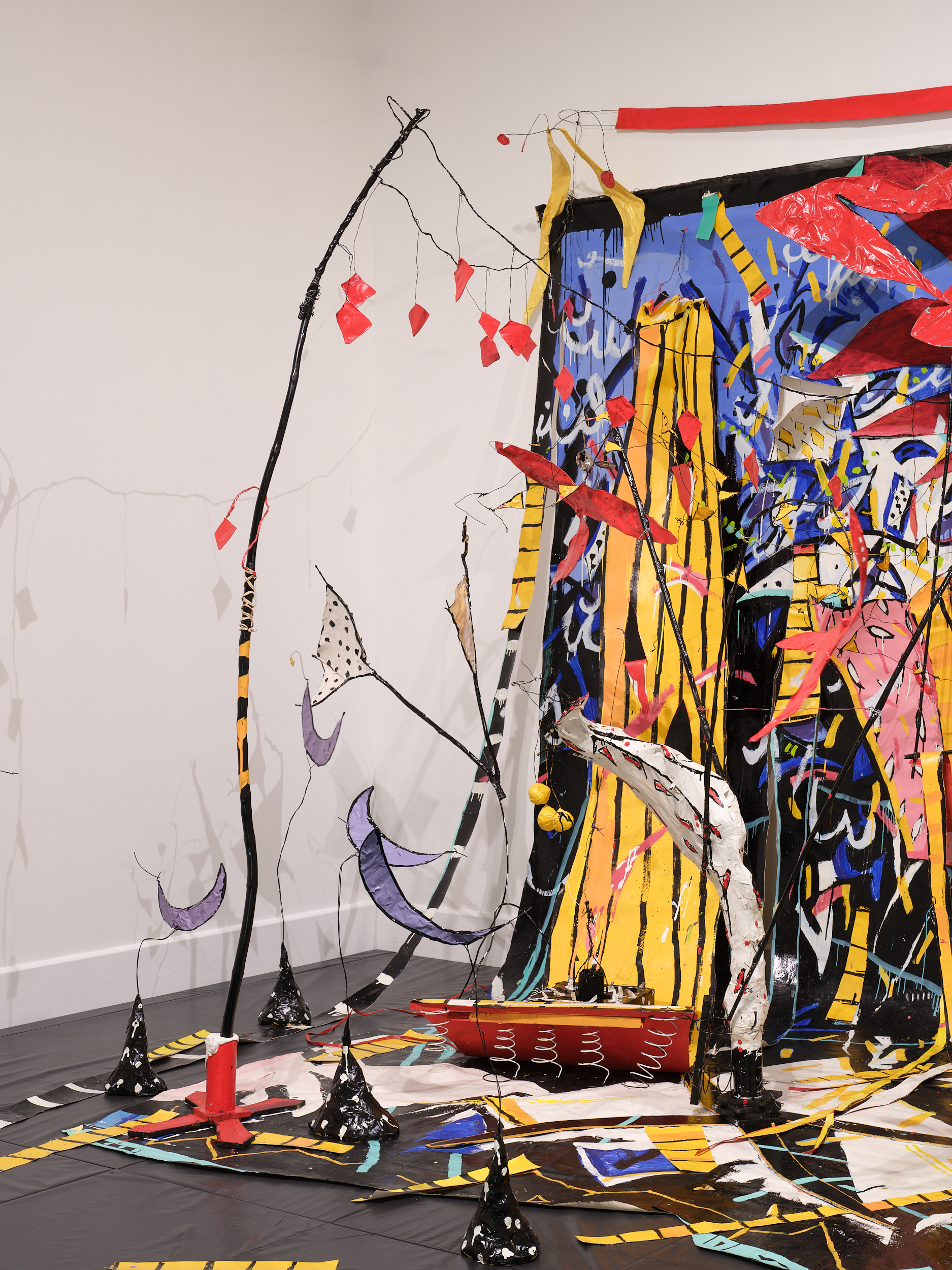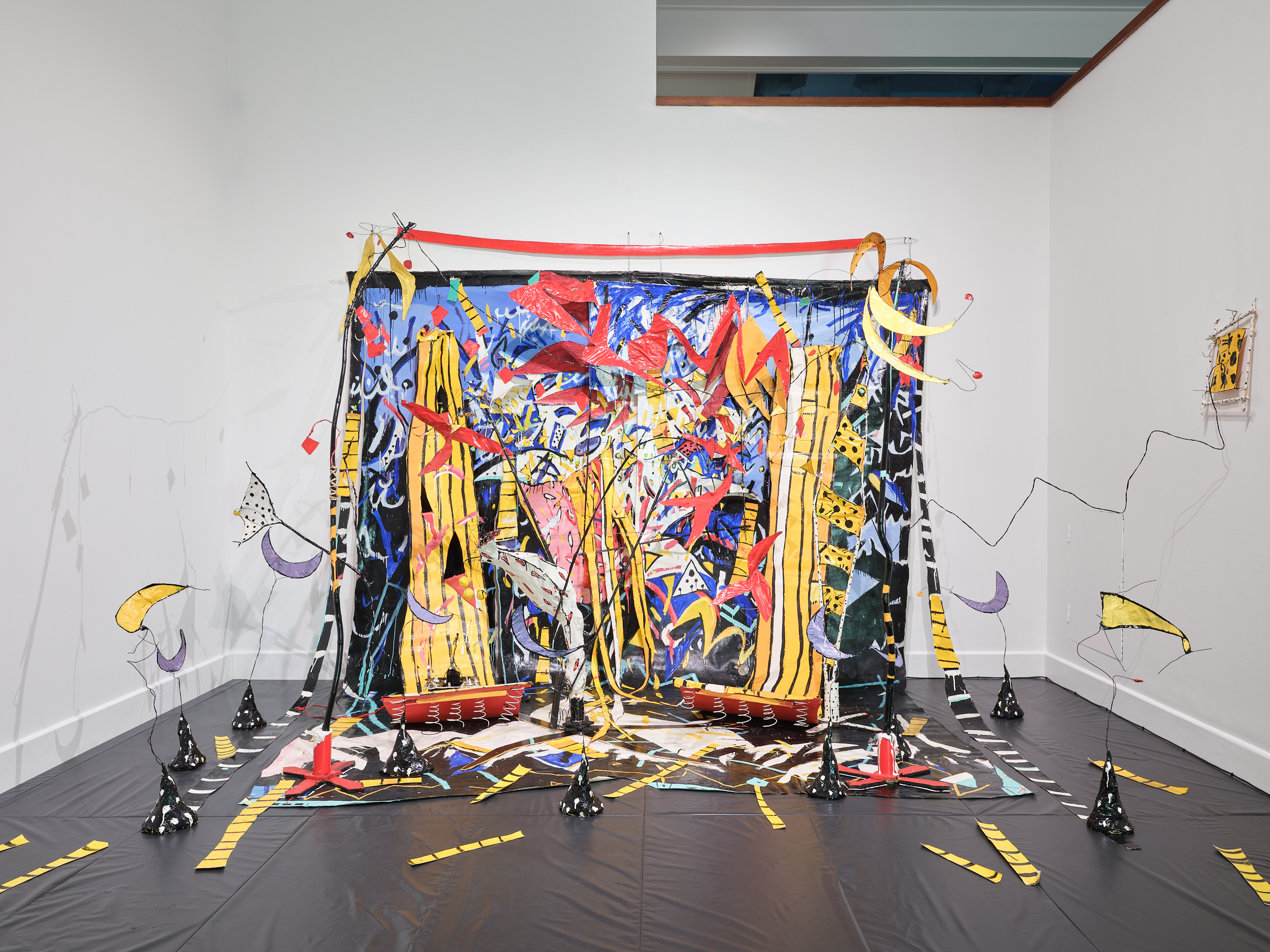 Central to this exhibition is the presentation and reimagining of an installation by Debra Bustin. First realised in 1982, and here extended far beyond its original form, the work is a key example of Bustin’s complex, joyous, room-spanning environments. Seeking to “explode” painting out of the confines of a two-dimensional surface, Bustin has described her works as “portals into possible worlds that are in the ongoing process of creation.”